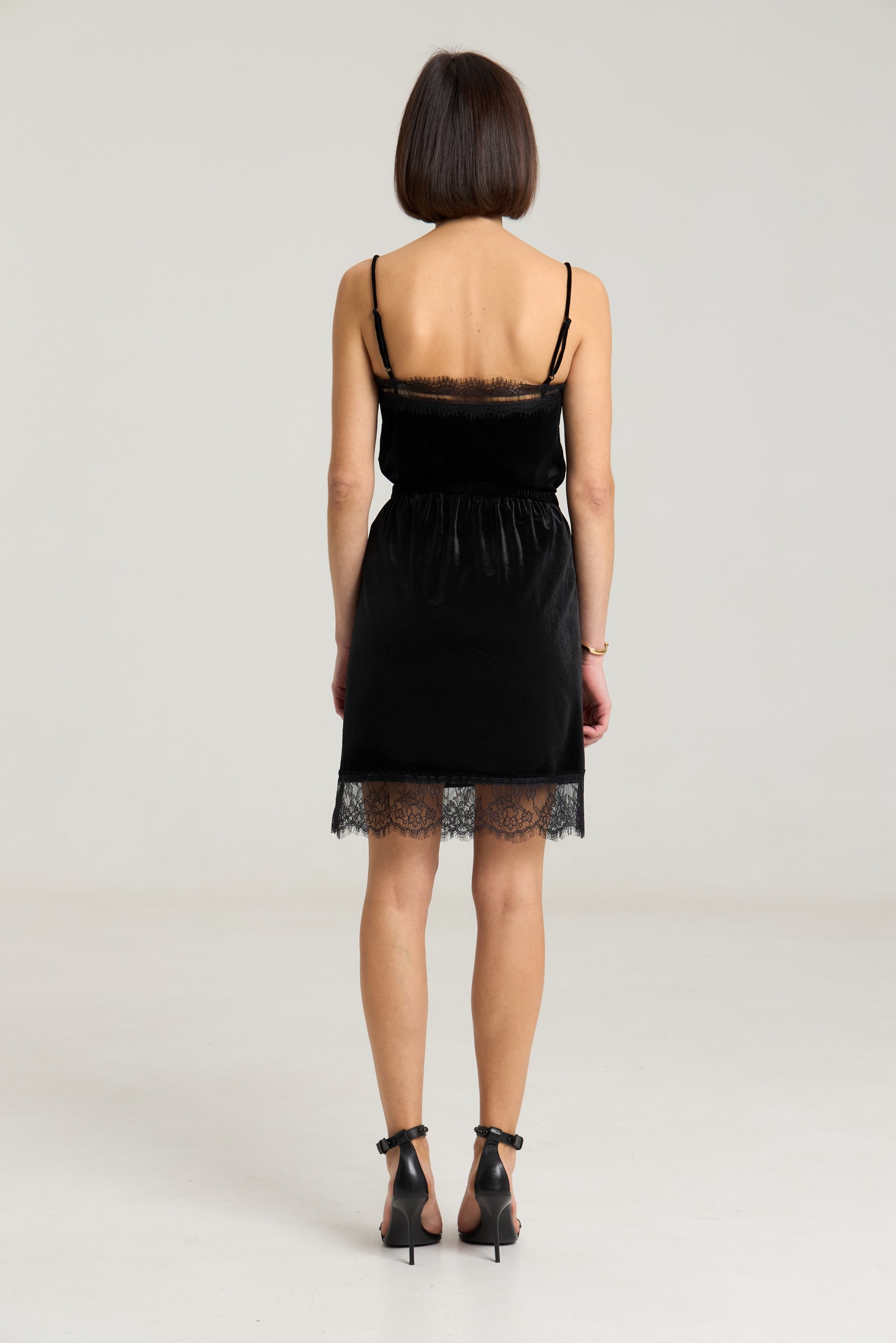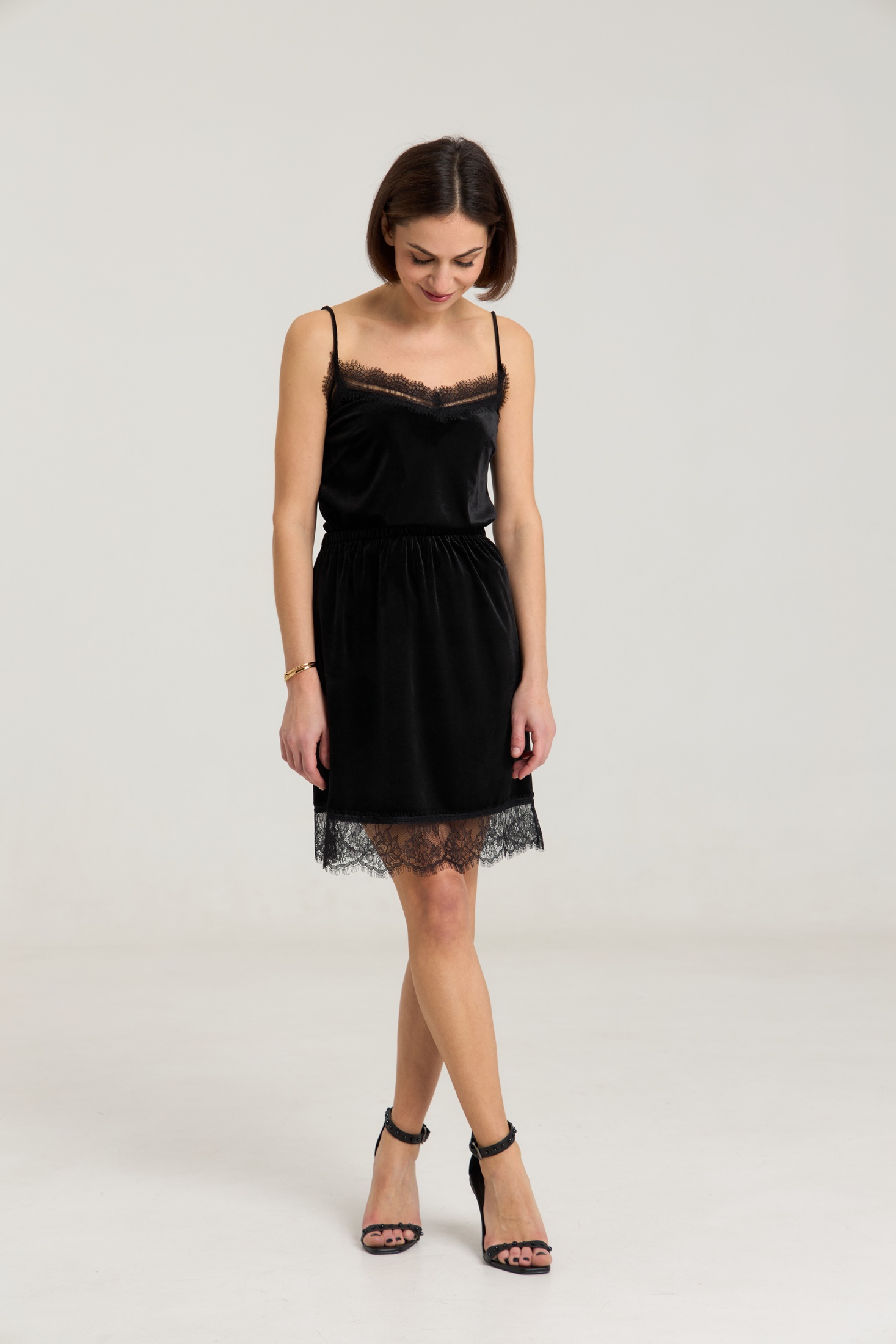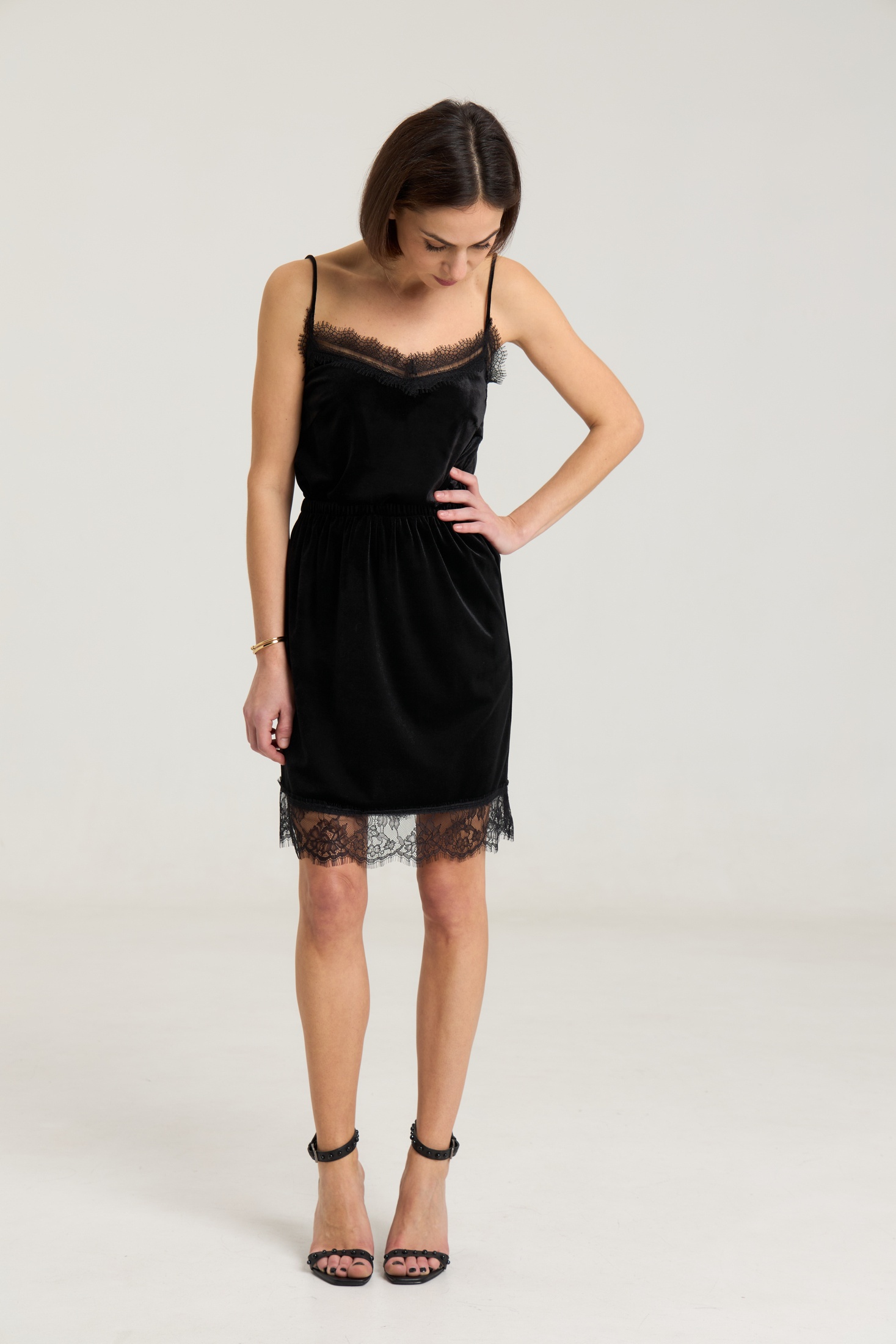 Комплект двухпредметный из топа и юбки, выполнен из мягкой велюровой ткани. Топ полуприлегающего силуэта, по переду и спинке отстрочено кружевом. Длина -40см с кружевом, полуобхват груди 40 см в 42-м размере.Юбка в длине миди выполнена из мягкой велюровой ткани черного цвета. Юбка на резинке, прямого силуэта, по низу отстрочено французким широким кружевом. Пот - 30 см, поб - 45см, длина по боковому шву с поясом 54 см - вместе с кружевом, ширина кружева 9 см. Юбка без подлкадки.