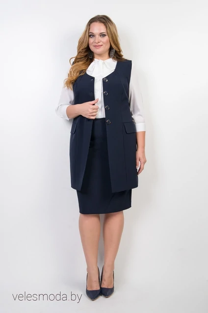 Универсальный офисный комплект из добротного костюмного полотна. Состоит из элегантного удлиненного жилета полуприлегающего силуэта с открытой горловиной, вертикальными рельефными швами, клапанами и комфортными карманами и юбки на притачном поясе, частично с резинкой. В среднем шве юбки выполнена шлица. Оба изделия на подкладке.