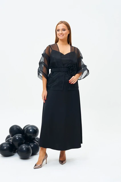 Комплект женский тройка состоит из кардигана, топа и юбки. Кардиган свободного покроя из однотонной органзы. По переду застежка на потайную кнопку. Горловина и край борта окантованы. Рукав втачной 3/4 с защипами. Топ на тонких бретелях из основной ткани. Юбка А-силуэта из плательной ткани атлас на подкладке, застежка-потайная молния в среднем шве заднего полотнища. В комплект входит сьемный пояс с отстегивающимся цветком.
