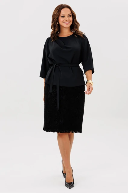 Комплект женский состоит из блузки и юбки. Блузка с цельнокроеным рукавом длиной 3/4. От правого плеча идут мягкие складки к центру переда. Застежка по центру спинки на петлю и пуговицу. По бокам небольшие разрезы. Блузка с поясом. Юбка на поясе выполнена из кружевного полотна на подкладке из основной ткани. На поясе по бокам эластичная тесьма. По среднему шву задней половинки юбки молния, снизу разрез 13,5 см.
