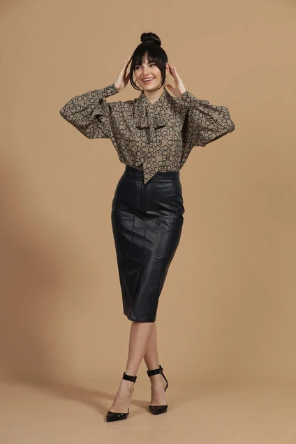 Комплект женский 2-х редметный.Состоит из блузы и юбки из эко-кожи на хлопковой основе.