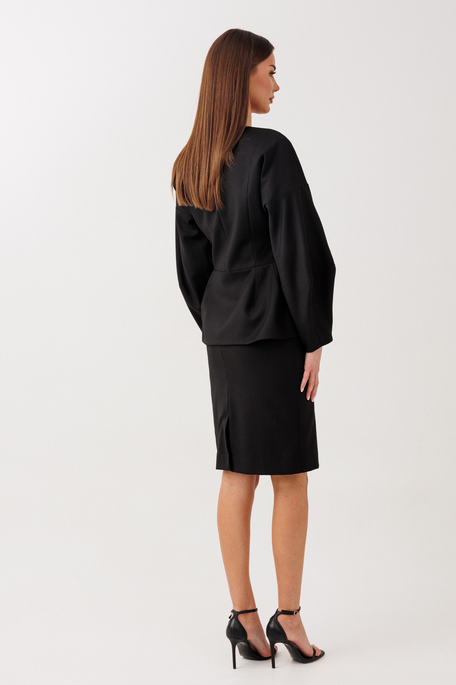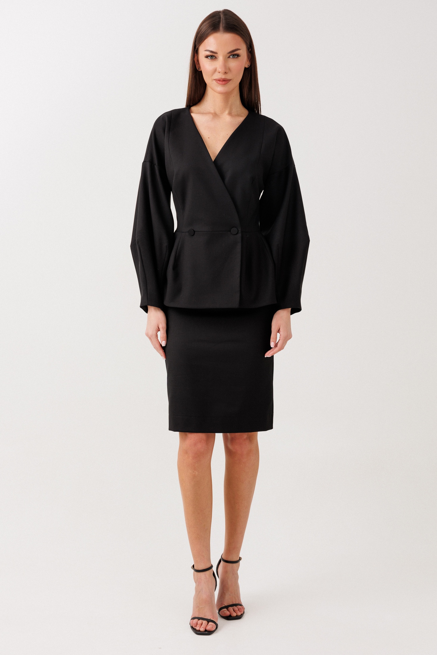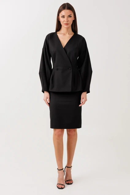 Костюм с юбкой 1115 V&N fashion — идеальное дополнение для вашего гардероба. Коллекция бренда V&N fashion предлагает стильный комплект, выполненный из полиэстера, вискозы и спандекса, что обеспечивает комфорт и лёгкость в носке. Жакет имеет приталенный, двухбортный фасон с декоративной застежкой на петли-пуговицы и спущенный рукав-фонарь, добавляющий образу женственности. Юбка с миди длиной и разрезом по спинке подчеркивает элегантность комплекта. Потайная молния на юбке сохраняет цельность дизайна. Черний цвет делает костюм универсальным для офисного и повседневного использования. Подходит для весенне-летнего сезона.