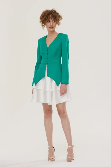 Комплект 2-х предметный (жакет и юбка).Жакет прилегающего силуэта, выполнен из костюмной ткани. Отрезной по линии талии, баска фигурной формы. Горловина V-образная. Застёжка на воздушные петли и пуговицы. Рукав