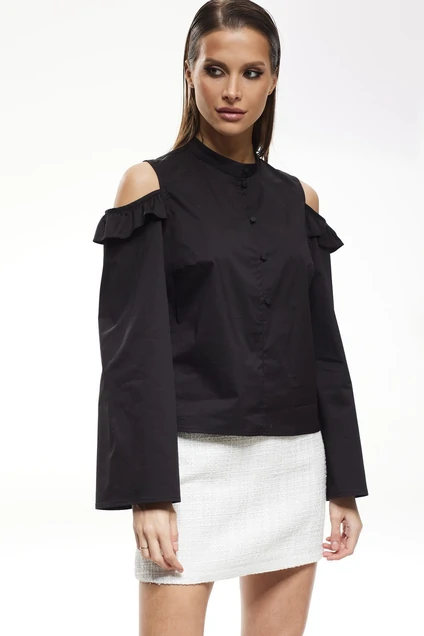 Комплект 2-х предметный, блузка и юбка. Блузка прямого силуэта с открытыми плечами. Застежка по переду на короткую планку на пуговицах. Воротник стойка. Рукава длинные, слегка расширены книзу. По верху рукава оборка.  рукав 53 см.