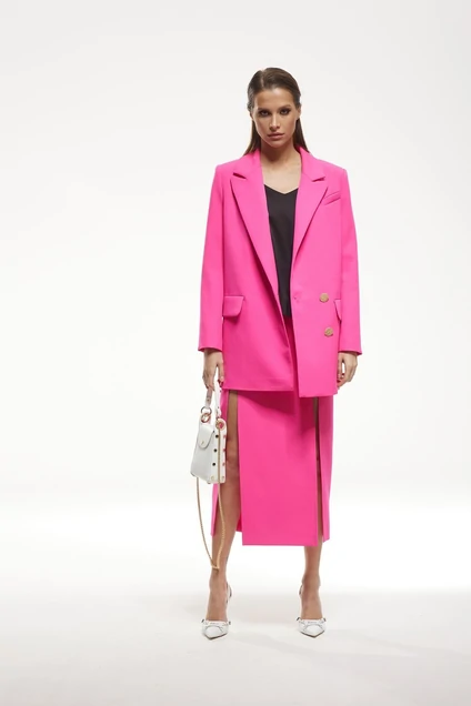 Жакет двубортный  прямого силуэта с застежкой  на петли и пуговицы. На переде прорезные карманы с клапаном. По спинке шлица. По низу рукавов шлицы с пуговицами. Жакет на подкладке. Рукав 63 см.