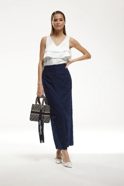 Комплект 2-х предметный блузка и юбка. Топ прямого силуэта из атласной ткани. Вырез горловины V-образный. В верхней части по спинке и переду воланы. Юбка макси из