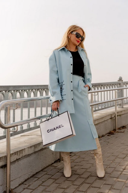 Комплект юбочный3-х предметный (жакет + блузка + юбка).Рубашка объемной формы из джинса. Застежка по переду на кнопки. По спинке кокетка и складки. Воротник рубашечный. Рукава длинные с манжетой по низу. Манжеты с застежкой на кнопку. На переде слева карман. На переде справа нанесена печать. Рубашка удлиненная. Низ фигурной формы.Майка свободной  формы из трикотажного полотна. Вырез горловины круглой формы. Длина до бедер. Рукава короткие.Юбка А-образного силуэта из джинсовой ткани, длина макси, разно уровневая линия низа, по переду, боку и задней части шлицы, в боковых швах карманы и застёжка на потайную молнию. Съёмный пояс. Рукав жакет: 75 см. (от горловины) топ: 23 см. (от горловины)