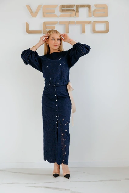 Комплект 2-х предметный блузка и юбка. Блузка свободного кроя со спущенной линией плеча. Вырез горловины круглой формы. Застежка по горловине спинки на петлю и пуговицу. Рукав объемный длиной ¾. Низ рукава собран на резинку. По низу блузка регулируется лентой-завязкой.Юбка макси из хлопковой ткани «шитье». Завышенная линия талии. Застежка по переду на кнопки. Юбка на подкладке. Рукав 59 см. (от горловины).
