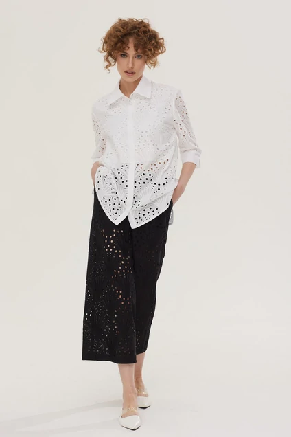 Комплект из хлопковой ткани «шитье». Блузка прямого силуэта. Застежка по переду на петли и пуговицы. Воротник рубашечный. Рукава прямые ¾. По низу рукава манжета с разрезом. Спинка удлиненная. Перед на