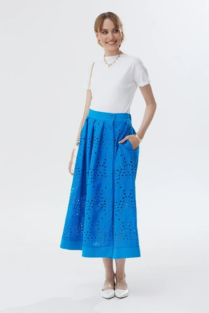 Комплект 2-х предметный: майка + юбка.Майка прямого силуэта, выполнен из трикотажного полотна. Рукав втачной. Юбка со складками из хлопковой ткани «шитье». Верх на поясе. В пояс по спинке вставлена резинка. Застежка по переду на петли и пуговицы. В боковых швах карманы. Юбка на подкладке.