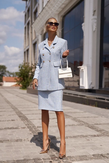 Костюм 2-х предметный, состоит из жакета и юбки, выполнен из костюмной ткани рогожка.Жакет полуприлегающего силуэта. Застежка двубортная на петли и пуговицы. Воротник отложной с лацканом. Рукав втачной,