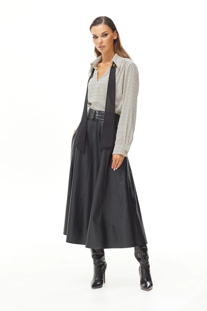 Юбка из «эко» кожи расширенная с клиньями. Длина миди. Верх на поясе с декоративным элементом и шнуровкой. Застежка по спинке на молнию. В боковых швах карманы. Юбка на подкладке. Рукав 60 см. блузка: 98 % ПЭ, 5 % спандекс.