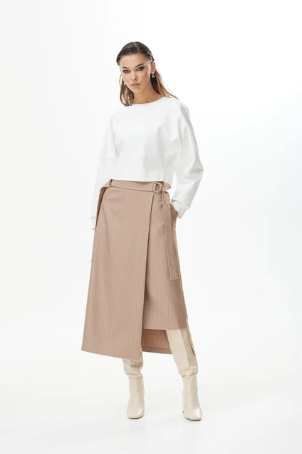 Комплект 2-х предметный: джемпер и юбка. Джемпер укороченный из трикотажного полотна. Расширена линия плеча. Рукав свободной формы собран на манжету. Вырез горловины круглой формы. Застежка по горловине спинки на потайную молнию. В левом боковом шве застежка на потайную молнию.Юбка на запах с асимметричной линией низа. Длина миди. Верх на поясе. По талии юбка фиксируется дополнительным поясом и полукольцами. Юбка на подкладке. Рукав 70 см. (от горловины) . юбка: 65 % ПЭ, 32 % вискоза, 3 % спандекс подкладка: 100 % ПЭ