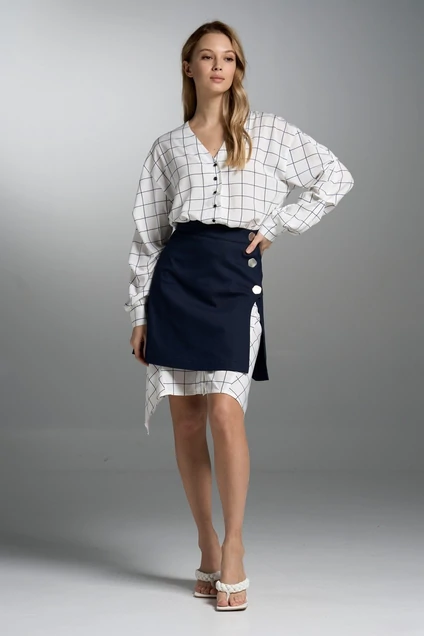 Комплект состоит из платья и юбки.Платье свободного покроя со спущенной линией плеча.Центральная бортовая застёжка на петли-пуговицы.Вырез горловины V-образной формы.Боковые швы с клиньями придающими легкое расклешение.Низ разноуровневый.Рукав со складками в верхнем шве и манжетой по низу, застежка на петлю-пуговицу.Юбка А-образного силуэта с застежкой на петли-пуговицы и разрезом слева.Верх юбки обработан притачным поясом.