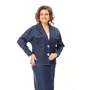 Костюм женский, состоит из жакета и юбки. Жакет приталенный на подкладке, с зауженным плечевым поясом.Центральная однобортная застёжка на петли-пуговицы.Вырез горловины округлой формы.Перед и спинка с рельефами.На полочках накладные карманы с пуговицами.Рукав втачной двухшовный сложного покроя.По окату рукава выполнен пластрон декоративными складками и легкой сборкой под ним.Юбка на подкладке зауженного силуэта.По переду и спинке выполнены рельефы.В среднем шве спинки застежка на потайную тесьму-молнию и шлица.Пояс притачной с резинкой в боковых швах.