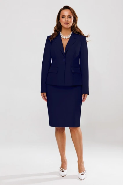 Жакет приталенного силуэта с естественной линией плеча на подкладке. Спинка со средним швом и рельефами из плеча. Перед с рельефами из плеча, прорезными карманами "в рамку" и клапанами. Застежка центрально-бортовая на петлю-пуговицу. Воротник отложной пиджачного типа.
