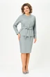Костюм женский двухпредметный, состоящий из жакета и юбки. Жакет полуприлегающего силуэта со слегка спущеной линией плеча, на подкладке, со смещенной застежкой на 3 пели-пуговицы по линии борта 1 потайной петлей-пуговицей и нагрудными вытачками, выходящими из боковых швов. Горловина с фигурной планкой по переду и спинке. Спинка со средним швом. Рукав втачной длинный двухшовный. Изделие со съемным поясом. Юбка- карандаш длиной за колено, зауженная к низу, с кокетками со шлевками. Переднее полотнище с имитацией карманов и рельефным швом, заканчивающимся разрезом. Заднее полотнище со средним швом, в котором обработана застежка на 2 петли-пуговицы по кокетке и потайная тесьма-молния.