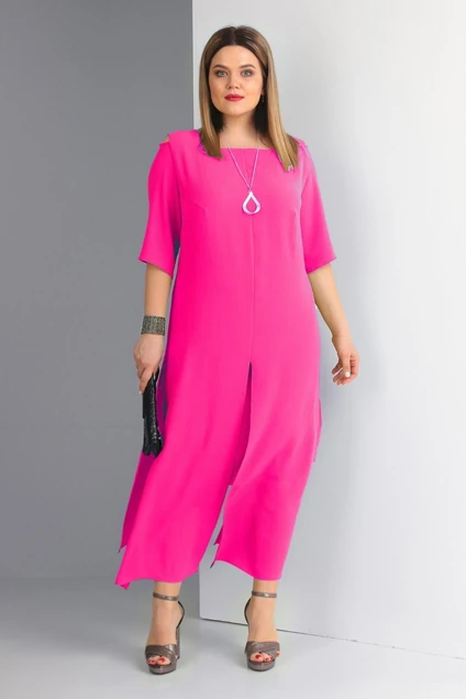 Комплект женский, состоящий из туники и юбки. Туника прямого силуэта, с двумя нагрудными вытачками. Перед и спинка изделия со средним швом, внизу которых обработаны разрезы. В боковых швах также обработаны разрезы. Рукава втачные, двухшовные, длиной до локтя, с окантованным вырезом по окату. Горловина фигурная. Юбка прямого силуэта. По переду и по спинке юбка с двумя талевыми вытачками. Спинке со средним швом, в котором расположены застежка на тесьму-молнию и разрез. Верхний срез юбки обработан поясом из основной ткани, застёгивающийся на пуговицу. Комплект украшен декоративной подвеской. Длина туники - 134 см, длина юбки - 64 см