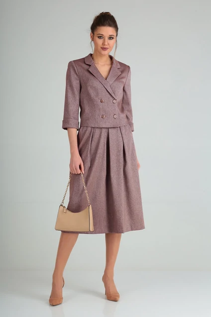 Костюм женский, состоящий из жакета и юбки. Жакет полуприлегающего силуэта, двубортный. Воротник пиджачного типа с лацканами. Рукава втачные, двухшовные на манжетах, 3/4. По переду и спинке изделия вытачки в области лини талии. Юбка удлиненная, на поясе с эластичной тесьмой. Юбка с боковыми карманами и складками в области талии по переду изделия. Длина жакета - 48 см, длина юбки - 72 см, длина рукава - 45 см.