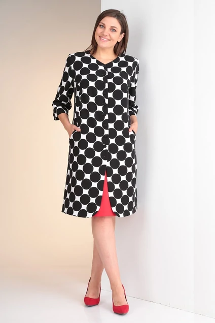 Комплект женский, состоящий из удлиненного жакета и юбки. Жакет с центральной застежкой на 8 пуговиц и 8 обметанных петель. Перед с двумя нагрудными вытачками и двумя рельефами от них, в которых находятся карманы. Спинка с двумя талиевыми вытачками. Рукава втачные двухшовные с широкой манжетой, застегивающейся на пуговицу и обметанную петлю. Юбка прямая, на поясе. По спинке со средним швом, в котором расположена застежка и разрез. Длина жакета - 96-101 см, длина юбки - 61-62 см. юбка - ПЭ 70%, вискоза 25%, спандекс 5%