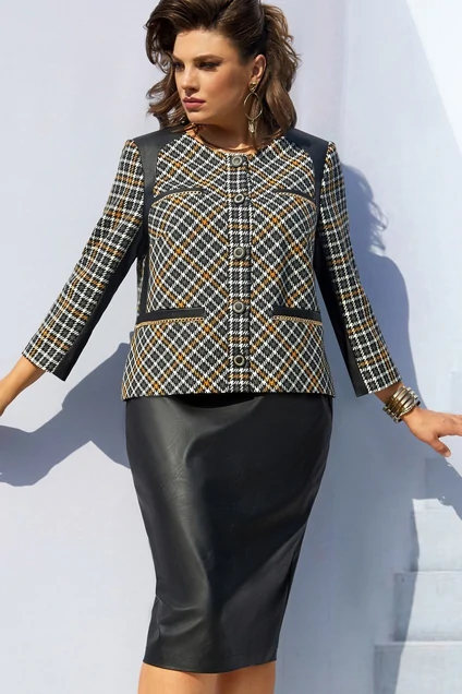 Состав: Жакет - ткань текстильная полиэстер. Юбка эко-кожа 60% полиэстер, 40% полиуретан. Подкладка 100% полиэстер. Классика, которая не подвластна времени! Комплект в стиле "Шанель" создает роскошный, утонченный образ. Безумно красивый и стильный комплект с самым модным принтом «клетка»! Контрастная отделка подчеркивает линии, а бочки визуально стройнят и вытягивают фигурку. Комплект состоит из жакета и юбки. Жакет полуприлегающего силуэта с округлой горловиной. Застежка на планку и пуговицы. По переду две декоративные листочки и два прорезных кармана с листочками. Все листочки выполнены из эко-кожи и подчеркнуты отделочными цепочками в цвет золота. Кокетки переда переходят в отрезные бочки, они так же выполнены из эко-кожи. Спинка без элементов. Рукав втачной, двухшовный, нижняя часть рукава выполнена из эко-кожи. Юбка с поясом, по поясу вставлена резинка, заднее полотнище со средним швом, в шов вставлена контрастная отделочная молния под золото, в среднем шве шлица. Жакет и юбка на подкладке. Длина рукава жакета 51 см (р.50-54), 52 см (р.56-60). Длина жакета вдоль середины спинки 60 см (р.50-54), 62 см (р.56-60). Длина юбки по среднему срезу заднего полотнища с учетом пояса 68 см (р.50-54), 70 см (р.56-60).