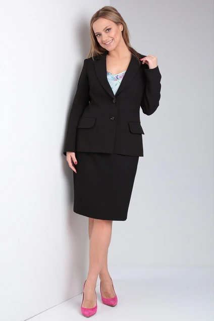 Костюм женский, состоящий из жакета и юбки. Жакет однобортный, приталенный на подкладке. Воротник отложной с лацканами. Спереди расположены карманы с клапаном. Рукав втачной, двухшовный. Длина рукава для роста 164 см 60 см, для роста 170 см 62 см. Длина изделия от плеча по спинке для роста 164 см 64 см, для роста 170 см 65 см. Юбка -карандаш на подкладке. На задней половинке юбки разрез и застежка «молния». Пояс притачной с пуговицей. Длина юбки от пояса 60 см для роста 164 см, 62 см для роста 170 см.