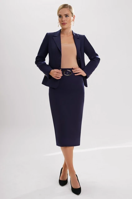 Жакет женский с центральной бортовой застежкой на 2 петли и пуговицы, на подкладке. Перед жакета с рельефным швом, выходящим из проймы и идущим до низа, и талиевой вытачкой, выходящей из горизонтального подреза расположенного чуть ниже линии талии, в котором обработан прорезной карман “в рамка” с клапаном. Углы клапана скругленные. Спинка жакета с рельефными швами, выходящими из проймы и идущими до низа, и средним швом. Рукав втачной двухшовный с шлицей в нижней части локтевого рукава, застегивается на 3 петли и пуговицы. Горловина обработана отложным воротником пиджачного типа. Жакет с плечевыми накладками. Юбка женская с завышенной линией талии на обтачке, зауженная к низу, на подкладке, со съемным поясом из основной ткани застегивающимся на пряжку (размер и цвет фурнитуры может незначительно отличаться от фото). В верхней части переда и спинки стачаны талиевые вытачки и настрочены шлевки для удерживания пояса. В среднем шве спинки юбки, в верхней части обработана застежка на потайную тесьму-молнию, в нижней части - шлица. Средние:длина жакета по среднему шву спинки – 59,0 см (±3,0 см), длина рукава – 61,0 см (±1,0 см), длина юбки по среднему шву спинки 79,0 см - см (±3,0 см), длина блузы по середине спинки - 52,0 см (±3,0 см), длина рукава блузки - 42,0 см (±1,5 см) Тип ткани на жакет и брюки: костюмно-плательная.