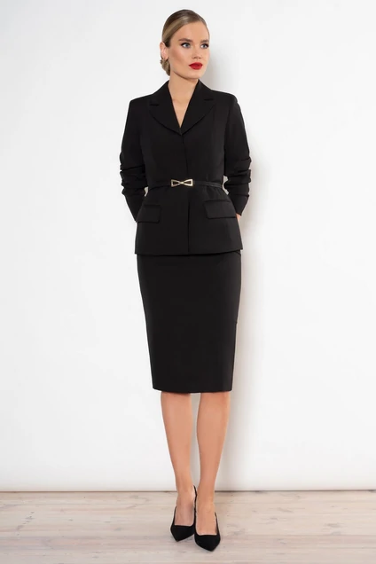 Костюм женский двухпредметный, состоит из жакета и юбки. Костюм предназначен для повседневной носки, всесезонный. В комплект к костюму идет съемный ремень с декоративной пряжкой (цвет и размер фурнитуры может незначительно отличаться от фото).
