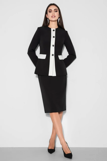 Чёрный костюм является неотъемлемой частью гардероба современной женщины, её визитной карточкой. Ведь никакая другая одежда не сможет придать образу одновременно и неповторимую элегантность, и представительный вид. Костюм женский из костюмно-плательной ткани с центральной бортовой застежкой на 4 петли и пуговицы (размер и цвет фурнитуры может незначительно отличаться от фото), расположенных на притачной планке, с отделочными деталями контрастного цвета, состоит из жакета и юбки. Жакет на подкладке, с плечевыми накладками.