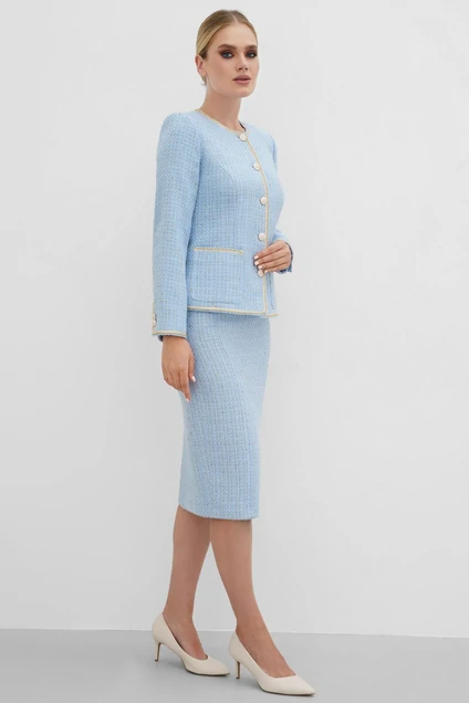 Прекрасный костюм в стиле Шанель, создает роскошный и утонченный образ. Костюм женский из костюмно-плательной ткани типа Chanel, состоит из жакет полуприлегающего силуэта на подкладке, и юбки-карандаш на подкладке. Костюм может использоваться и как нарядный, так и для повседневной носки. Жакет женский с центральной бортовой застёжкой до верха на 5 петель и пуговиц (размер и цвет фурнитуры может незначительно отличаться от фото) и отделочной тесьмой с цепью, идущей по горловине, вдоль борта, карманам, низу переда и рукава. Перед жакета с рельефными швами, выходящими из проймы до низа и накладными карманами с тесьмой. Спинка с рельефными швами и средним швом. Рукава втачные, двухшовные, длинные. По локтевому шву обработана шлица с двумя пуговицами и отделочной тесьмой. Горловина круглой формы, обтачная. Плечевой пояс оформлен плечевыми накладками. Юбка женская зауженная к низу с завышенной линией талии, длиной ниже колена, на подкладке. По переду вертикальные рельефные швы. Спинка юбки с талиевыми вытачками, средним швом в котором обработана застежка на потайную тесьму-молнию и шлица. Верхний срез юбки обработан подкладкой. Длина жакета по среднему шву спинки - 60,0 см (±3,0 см). Длина юбки по среднему шву задних половинок - 79,0 см (±3,0 см). (костюмно-плательная)