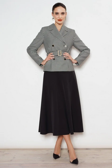 Этот женский костюм с жакетом и юбкой расширенной к низу, выглядит очень элегантно. Жакет выполнен в классическом стиле и имеет узор "гусиная лапка", который придает ему особый шарм и элегантность. Этот костюм подчеркивает женственность и стиль своей обладательницы.