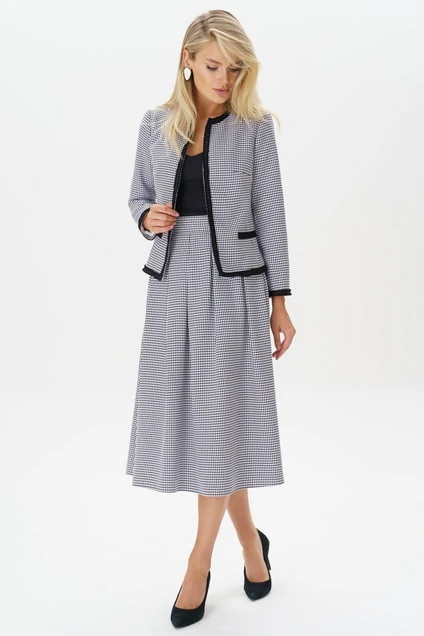 Юбка длиной миди со складками. Верхний край юбки с широким поясом, с 50р по спинке пояса юбки идет резинка. В левом боковом шве обработана застежка на потайную тесьму-молнию и петлю и пуговицу на поясе. Средняя длина жакета по середине спинки - 54,0 см (±3,0 см), Средняя длина рукава ⅞ - 53,0 см (±2,0 см), Средняя длина юбки по боковому шву с поясом - 83,0 см (±3,0 см), Ширина пояса - 5,0 см.