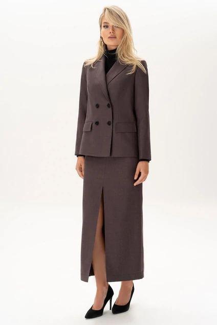 Длинная юбка, составляющая основу костюма, выполнена из мягкой шерстяной ткани, который обеспечивает максимальный комфорт в течение всего дня. Она прекрасно сочетается с приталенным жакетом, создавая изысканный и модный образ.