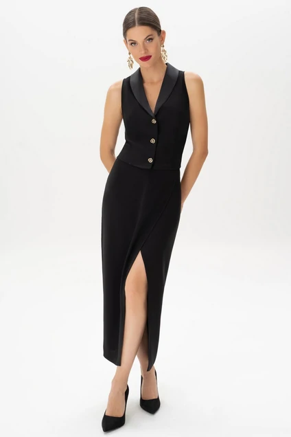 Перед вами воплощение утонченного стиля и элегантности - женский костюм с юбкой и приталенной жилеткой, выполненный в роскошном черном цвете. Юбка миди идеально подчеркивает женственные изгибы, а жилетка с изящными лацканами привлекает внимание к зоне декольте. В этом костюме вы почувствуете себя настоящей иконой стиля, притягивая восхищенные взгляды окружающих.