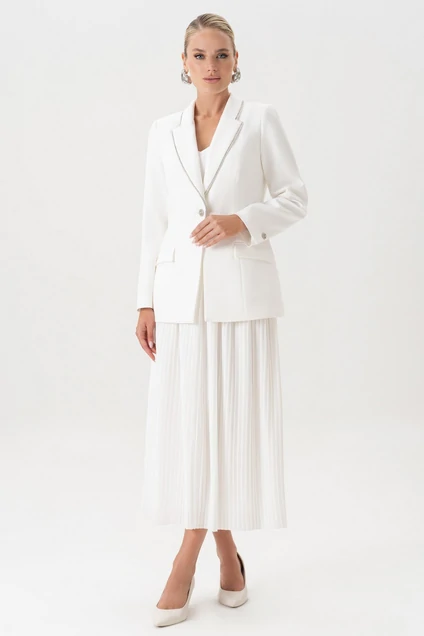 Изысканный комплект в белоснежном цвете, который объединяет элегантность и женственность. Прямой удлиненный жакет с тонкой серебристой отделкой на лацканах придает образу нотки роскоши. Плиссированная юбка ссоздает воздушность и легкость, добавляя динамики вашему силуэту. Этот ансамбль идеально подойдет для особых случаев, вечерних мероприятий или делового ужина. Дополните комплект минималистичными аксессуарами и классическими туфлями для создания утонченного и гармоничного образа.