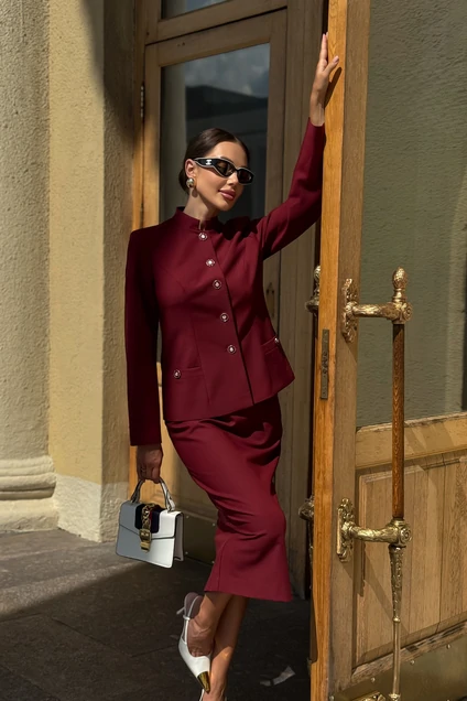 Костюм с юбкой 25-604-1 ЮРС от бренда URS сочетает в себе строгость и стиль. Коллекция бренда URS представлена в роскошном бордовом цвете, подчеркивающем изысканность и уверенность. Изготовленный из костюмной ткани с добавлением шерсти, полиэстера и эластана, этот костюм обеспечивает комфорт и утонченность. Жакет полуприлегающего силуэта с небольшими плечевыми накладками и застежкой на пуговицах придаёт образу строгую элегантность. Юбка прямого кроя с потайной молнией и шлицей обеспечивает удобство и свободу движения, делая костюм идеально подходящим для офисных и официальных мероприятий. Тёмно-бордовый цвет костюма подчёркивает его универсальность, делая его отличным вариантом для делового и вечернего гардероба в сезон осень-зима.