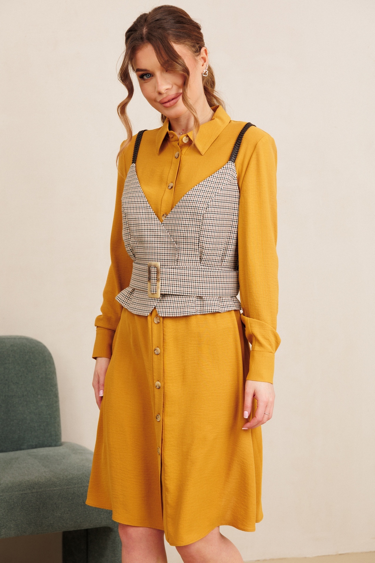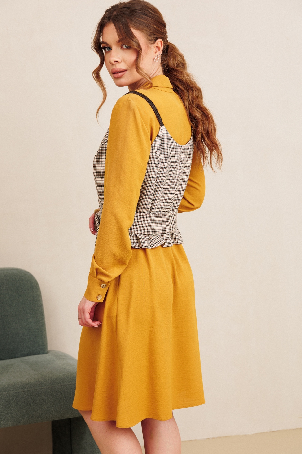 Костюм с платьем 7100 горчица + клетка Amori — идеальный выбор для стильных образов. Коллекция бренда Amori предлагает комплект, состоящий из яркого горчичного платья и клетчатого жилета. Выполненный из полиэстера и вискозы, этот наряд обеспечивает легкость и комфорт. Застежка на пуговицы по переду и пояс подчеркивают женственность и помогают создать приталенный силуэт. Жилет с защипами по талии добавляет элегантности. Стильный дизайн подходит как для повседневных прогулок, так и для праздников. Длина изделия 103 см, длина рукава 63 см, что делает его идеальным выбором для весны и осени. Горчичный цвет платья прекрасно сочетается с клетчатым узором жилета, создавая яркий и запоминающийся образ.