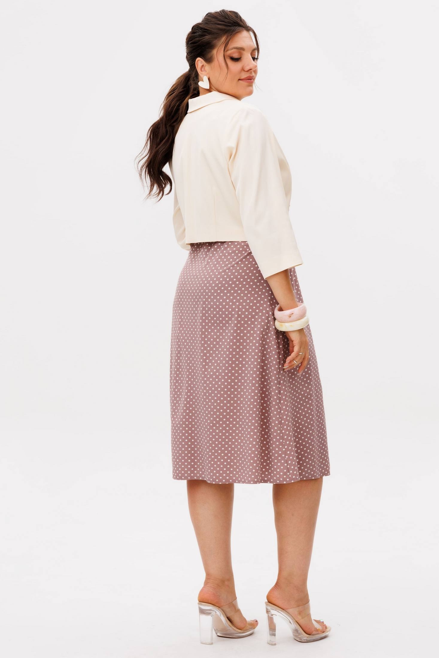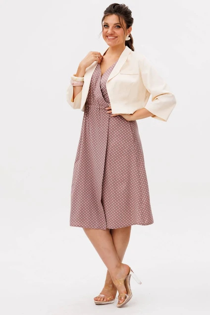 Костюм с платьем 1708 соевое молоко Anelli – это воплощение мягкого шарма и современной эстетики. Коллекция бренда Анелли предлагает лёгкий кроп-жакет и платье на запах с длиной ниже колена, создающие гармоничный и выразительный образ. Комплект выполнен из вискозной ткани, которая мягко струится и идеально подходит для повседневного ношения. Кремовые оттенки и горошковый принт добавляют свежести и романтичного настроения. Жакет с рукавами 3/4 и поясом на кулиске подчёркивает талию и регулирует посадку. Длина изделия от плеча для платья составляет 116–117 см, что делает его универсальным для разных случаев. Этот костюм прекрасно подойдёт для весны и лета, даря комфорт и уверенность в течение дня.
