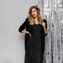 Элегантный женский комплект, включающий в себя жакет и платье, представлен в черном цвете с дизайном, сочетающим классику и современные элементы. Жакет оверсайз с прямым кроем удлиненной длины оборудован одной пуговицей для застежки спереди и отложным воротником с лацканами. Модель дополняется втачными рукавами со шлицами и фронтальными карманами на клапанах. Платье на тонких бретелях, выполненное из ткани с геометрическим принтом в бежево-черной цветовой гамме, облегает силуэт и расклешается к низу до уровня щиколоток, создавая мягкий и женственный образ. Подчёркивающая фигуру талия на спинке платья дополнена тонкой эластичной тесьмой для лучшей посадки. Оба изделия имеют подкладку для дополнительного комфорта. Этот комплект идеально подходит для вечерних мероприятий или официальных встреч, обеспечивая изысканный и модный образ.