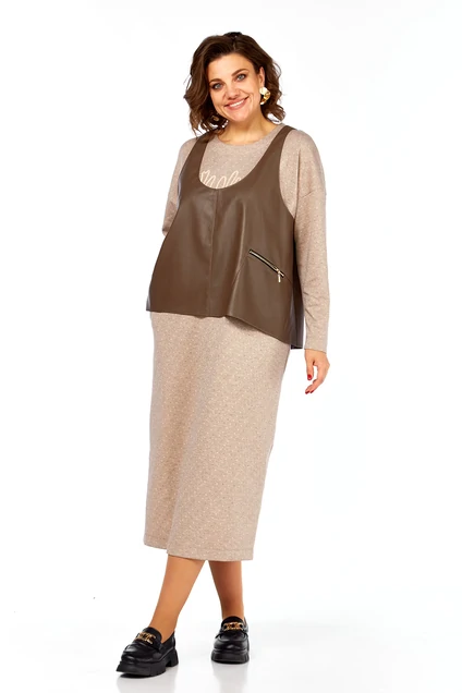Комплект женский двухпредметный, состоит из жилета и платья. Жилет выполнен из эко-кожи на вискозной основе А-силуэта. Перед со средним швом и с ассиметричным декоративным элементом. Спинка разрезная по центру. Платье прямого силуэта, выполнено из трикотажного полотна, горловина округлой формы. По переду нагрудные вытачки, спинка со средним швом, в котором обработана шлица. Рукава спущенные. В боковых швах имеются карманы. Платье дополнено вышивкой.