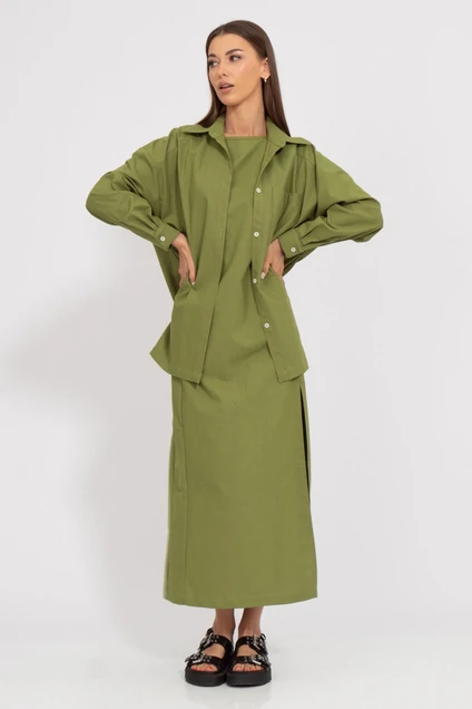 Блуза свободного кроя с длинными рукавами и пуговицами спереди обеспечивает максимальный комфорт и позволяет легко регулировать температуру тела. Удлинённое платье с боковым разрезом добавляет изысканности и шарма вашему образу, позволяя экспериментировать с различными аксессуарами и обувью.