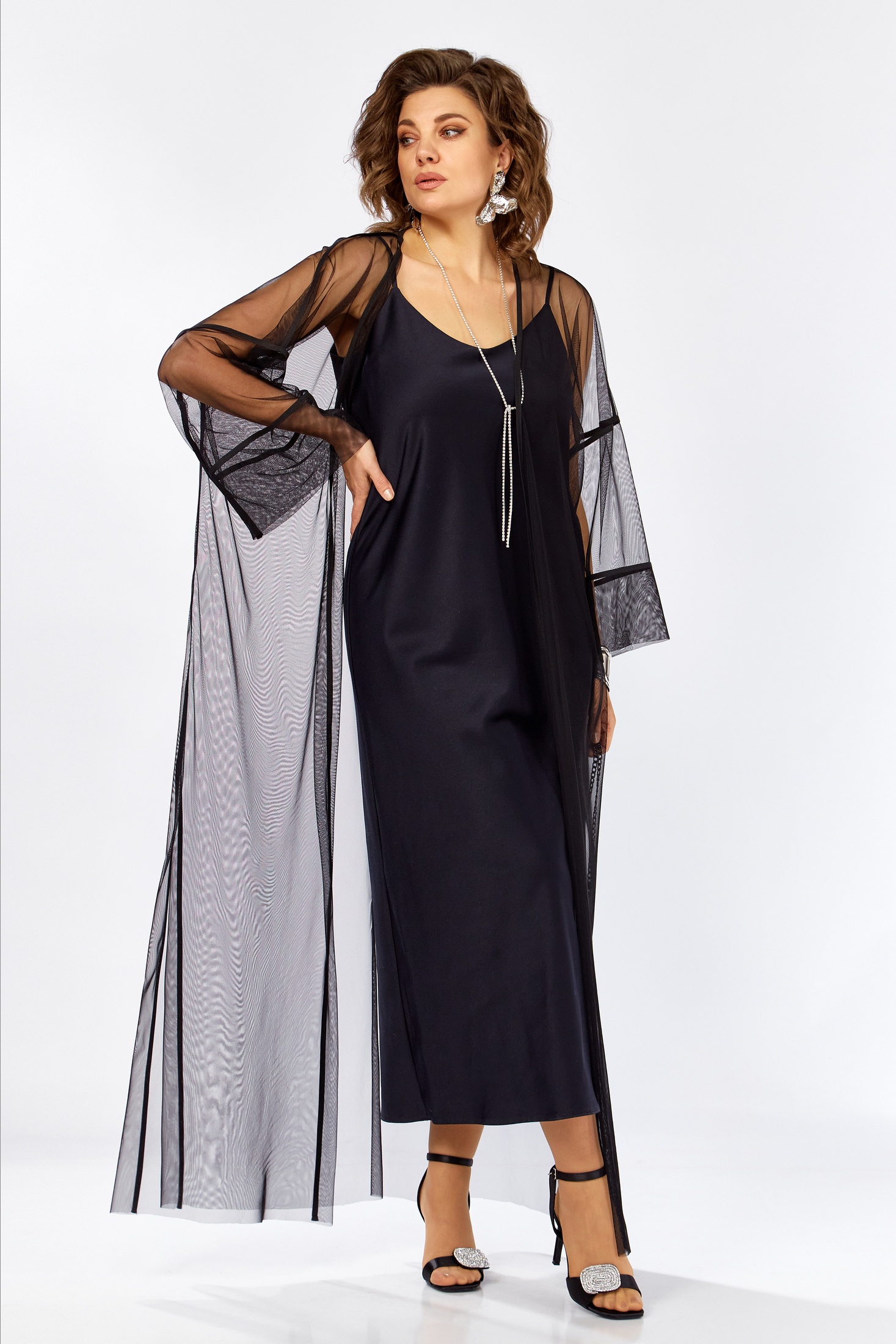 Изысканный комплект сочетает в себе платье из плотного атласа, свободного А образного силуэта , на Тонких бретелях и воздушную кардиган-шазюбль из сетки создавая образ утончённой элегантности женственности