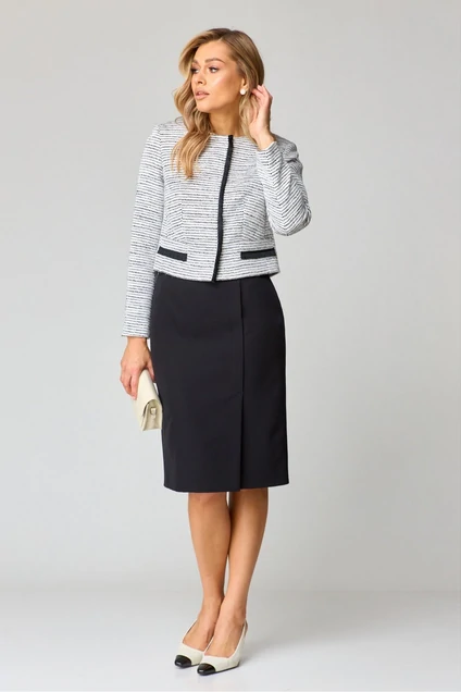 Комплект женский (жакет и платье). Жакет прямого силуэта, на подкладке, длиной выше линии бедер, с втачными рукавами, с центральной сквозной застежкой на 4 потайные кнопки. Детали переда жакета с отрезными бочками, с рельефными швами, на уровне линии талии расположены листочки с втачными концами и настрочена декоративная тесьма. Деталь спинки жакета с рельефными швами, исходящими от пройм. Рукава втачные двухшовные, с передним и локтевым швами. Вырез горловины округлой формы «под горло». Жакет с притачной понизу подкладкой. По правому краю борта настрочена декоративная тесьма. Платье женское, прилегающего силуэта, без рукавов, с втачным поясом на уровне линии талии, длиной до линии колена, с застежкой на потайную тесьму-молнию в левом боковом шве. Лиф детали переда и спинки на подкладке, с отрезными бочками, в швах которых обработана складка, переходящая на проймы. Переднее полотнище юбки с рельефным швом с правой стороны, который заканчивается шлицей, слева обработана вытачка. Заднее полотнище юбки со средним швом и вытачками. Вырез горловины платья округлой формы, обработан обтачкой. Декор может отличаться от представленного на фотографии.Жакет: длина спинки – 48,5см. Платье: длина спинки - 106см.