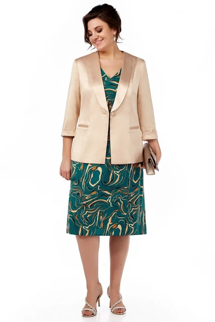 Костюм женский, состоящий из жакета и платья. Жакет прямого силуэта с центральной бортовой застежкой на одну петлю и пуговицу. Спинка жакета со средним швом, на полочках обработаны двойные рельефные швы, идущие от плеча и от пройм, между которыми обработаны карманы в рамку. Воротник «шаль», входящий в плечевые швы. Рукава втачные, двухшовные, длиной ¾, по низу рукавов отложные манжеты. Спинка и полочки жакета – на подкладке. Платье А-силуэта с V-образным вырезом горловины, длиной ниже линии колена, на подкладке. На спинке обработаны средний шов и рельефы от пройм. По переду платья – рельефные швы, идущие от пройм и нагрудные вытачки от рельефов. Рукава платья одношовные, втачные, короткие. Линия плеча в жакете и платье на естественном месте.