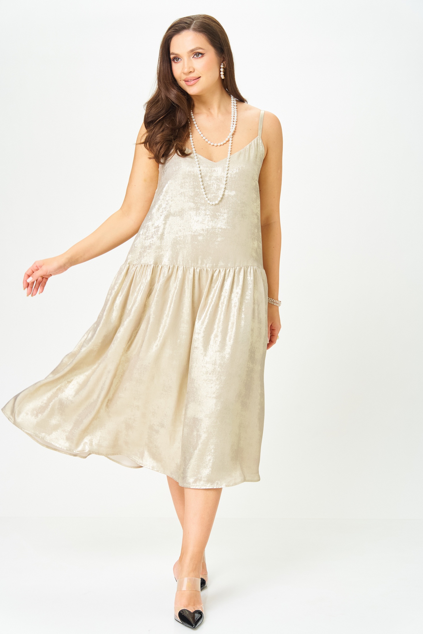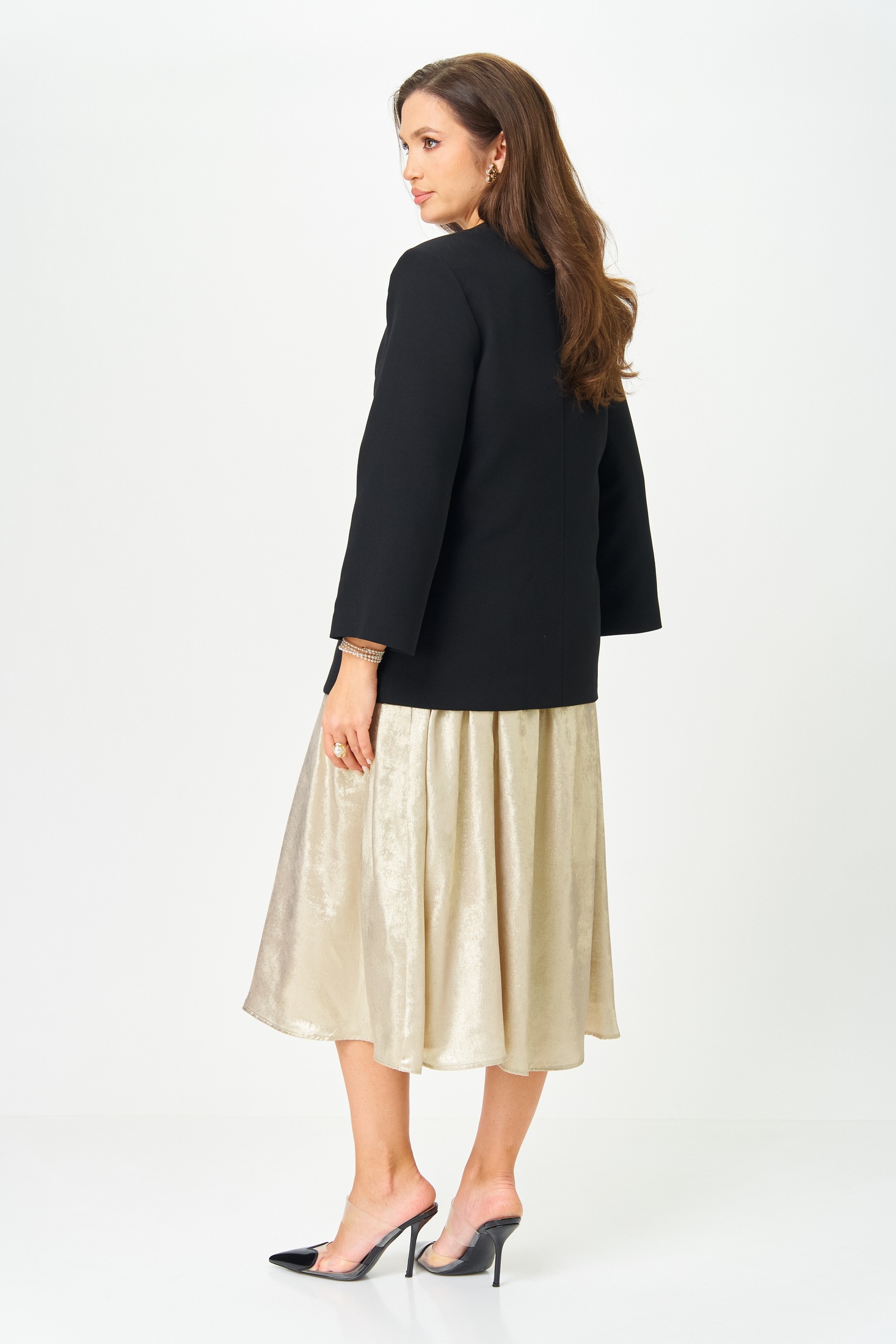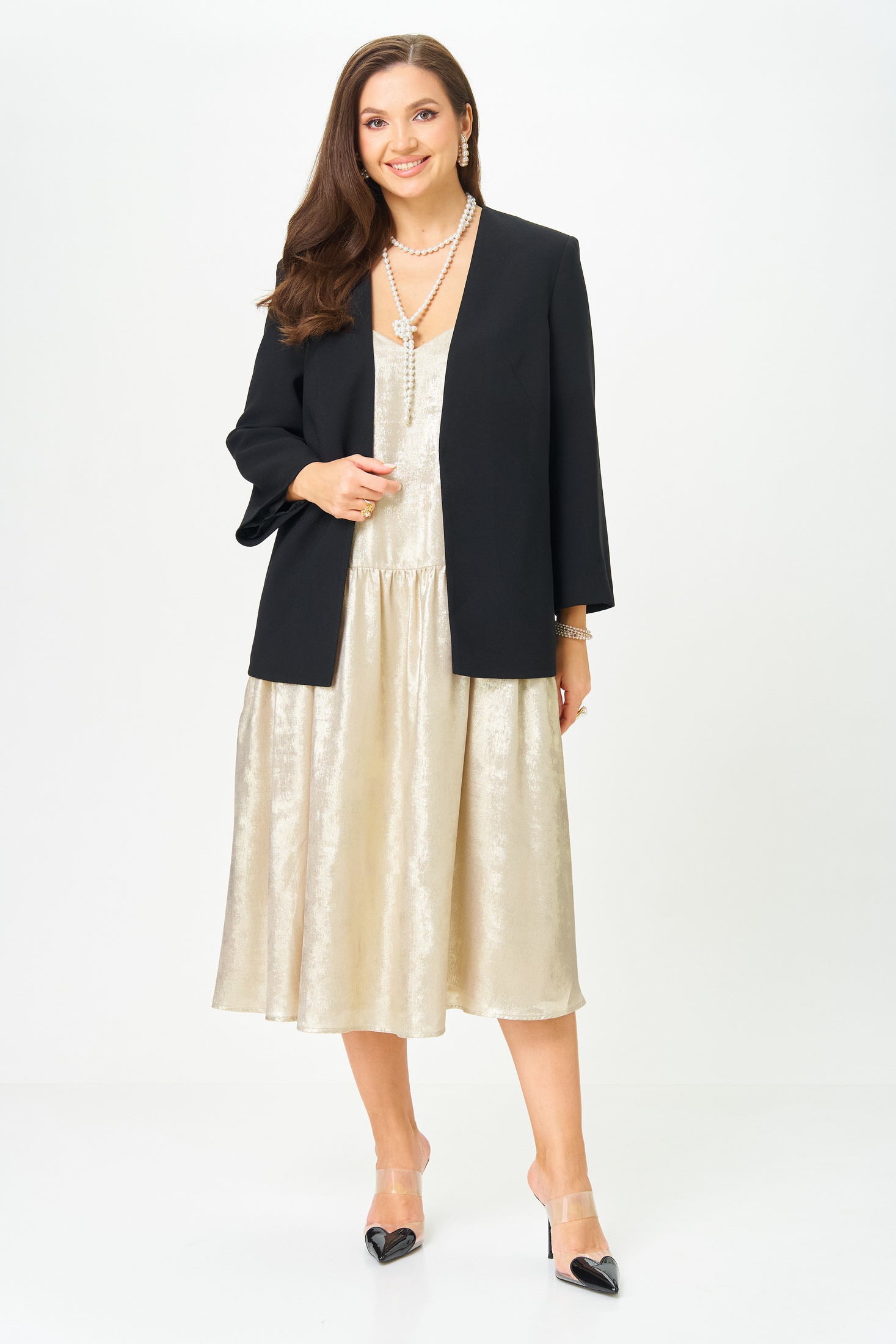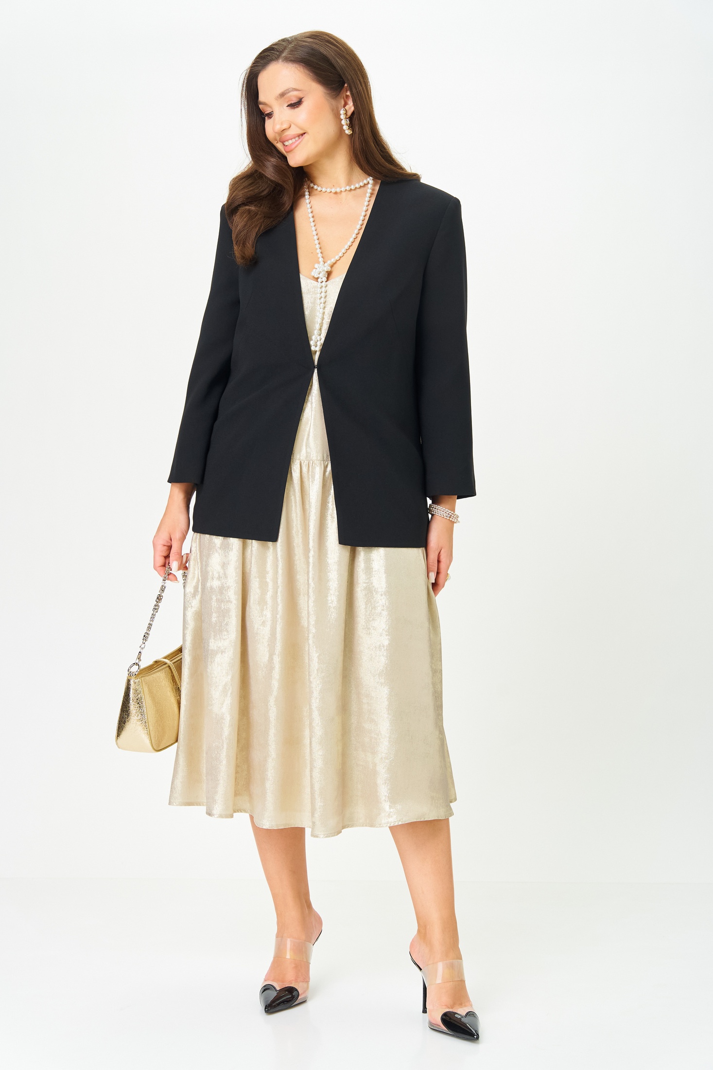 Костюм с платьем 20457 золотой с черным LeNata сочетает в себе изящество и комфорт. Коллекция бренда LeNata предлагает жакет и платье, выполненные из лёгких материалов. Жакет прямого силуэта, на подкладке, с V-образным вырезом и застёжкой на крючок, дополнит ваш образ для офиса или вечернего мероприятия. Платье A-образного силуэта изготовлено из ткани с эффектом мокрого шёлка, что придаёт ему сияние и лёгкость. Регулируемые бретели и функциональные карманы обеспечивают удобство и практичность. Комплект в золотом с чёрным цвете идеально подходит для носки в межсезонье, добавляя нотку изысканности в повседневные и торжественные образы.