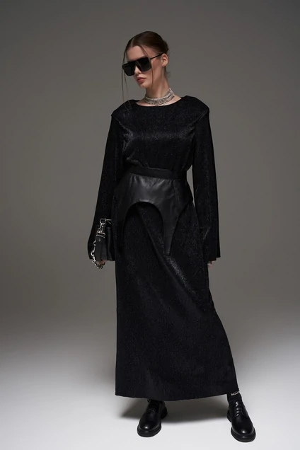 Комплектация пояс-баска, платье. Платье из фактурной жатой ткани на подкладке с плечевыми накладками. Пояс-баска из экокожи в комплекте