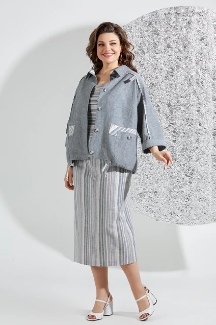 Женский комплект, свободного покроя, состоит из платья и летней куртки. Платье прямого силуэта, со спущенным рукавом, выполнено из льняной ткани в полоску. Горловина округлой формы, на обтачке, по переду выполнена кокетка с декоративным элементом, настрочным шнуром и пуговицами. Спинка из льна в полоску, рукав укороченный, с манжетой по низу. Куртка выполнена из однотонного льна, с отделкой из льна в полоску. Горловина обработана воротником, застежка по переду на петли-пуговицы. По полочке выполнена кокетка с кантом из льна в полоску, также на полочке обработаны накладные карманы из однотонного льна, с подложкой из настрочного прямоугольника из льна в полоску. Спинка также из однотонного льна, с кокеткой и кантом из льна в полоску. Рукав втачной, с подрезом и вставленным в подрез кантом из льна в полоску, по низу на манжете из полоски. В качестве дополнительного декоративного элемента, по низу куртки обработана кулиса с шнуром, что позволяет регулировать прилегание. Легкий комплект из натуральных тканей, отличный выбор для лета! Длина куртки 53см, длина платья 115см. В 60р Куртка: Ширина груди- 65см, Ширина талии -63см, Ширина бедер- 68см, длина рукава- 43см., ширина рукава 24,5см. Платье: Ширина груди- 63см, Ширина талии -61см, Ширина бедер- 70см, длина рукава- 27см., ширина рукава 24см.