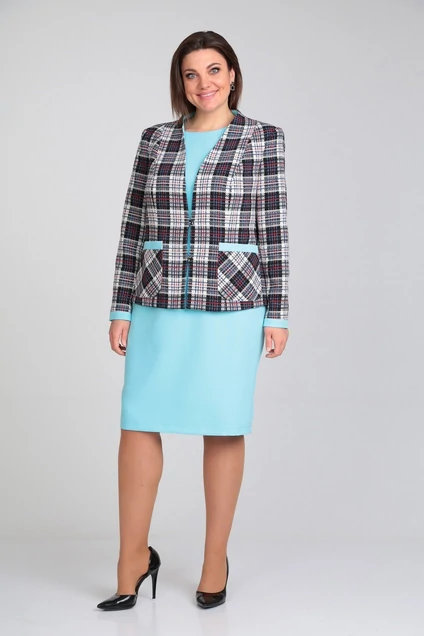 Элегантный женский комплект, состоит из жакета и платья, выполнен в стиле «шанель». Жакет из костюмной ткани в клетку (не тянется) на подкладке, полуприлегающего силуэта с застежкой встык на навесные петли и пуговицы, с V-образным вырезом и цельнокроенной стойкой. Перед с рельефами, накладными карманами. На карманах отрезные планки из отделочной ткани. Спинка со средним швом. Рукава втачные двухшовные. По низу рукава отрезная планка из отделочной ткани. Платье полуприлегающего силуэта без подкладки из однотонной ткани (чуть тянется). По переду нагрудные и талиевые вытачки. Спинка со средним швом и шлицей, застежкой – молнией и талиевыми вытачками. Рукава втачные, одношовные. Горловина оформлена вырезом округлой формы. Длина жакета – 65 см. Ширина спинки жакета – 42 см. Длина рукава – 62. Длина платья – 101. Ширина спинки платья – 40,5. Длина рукава платья – 24.