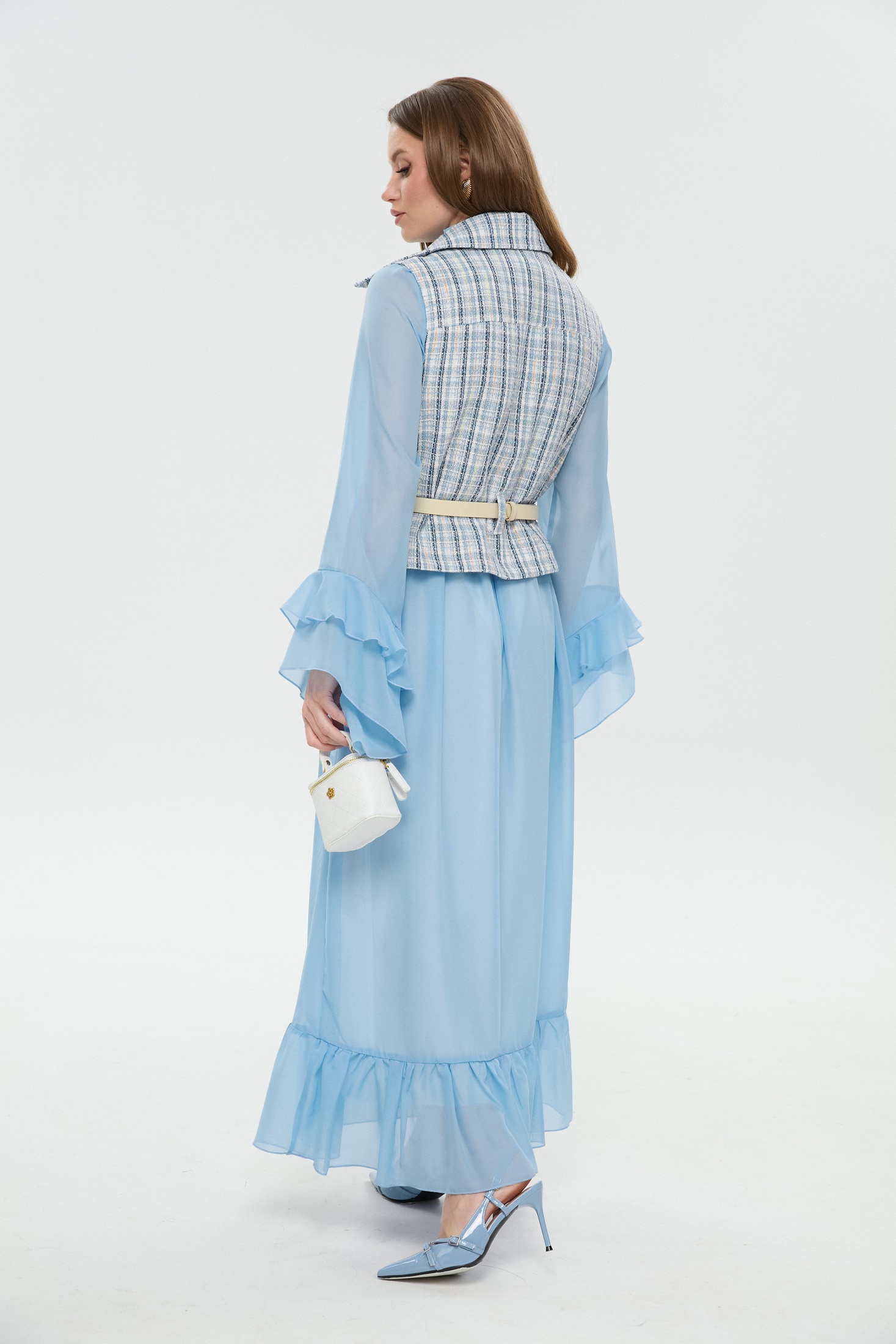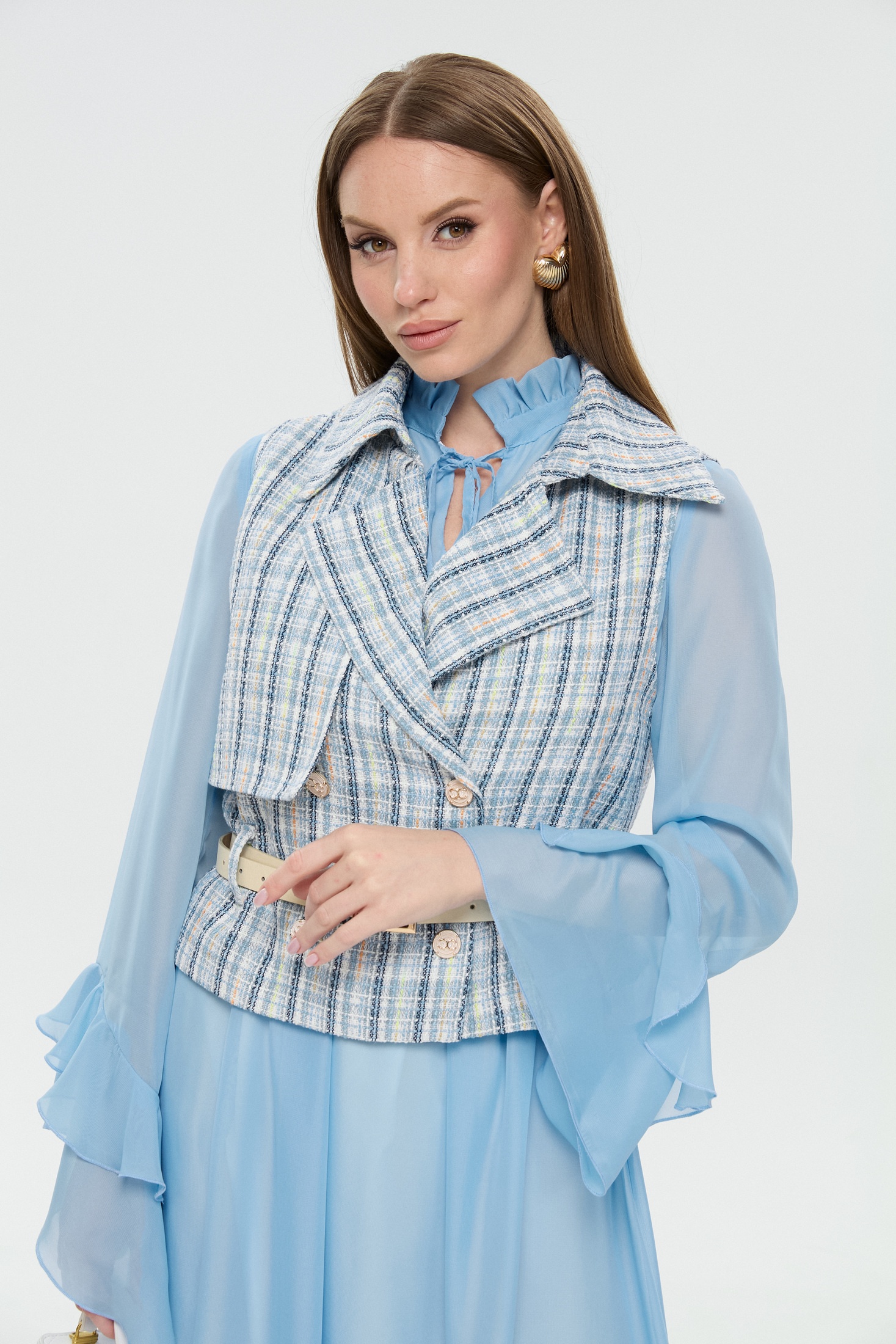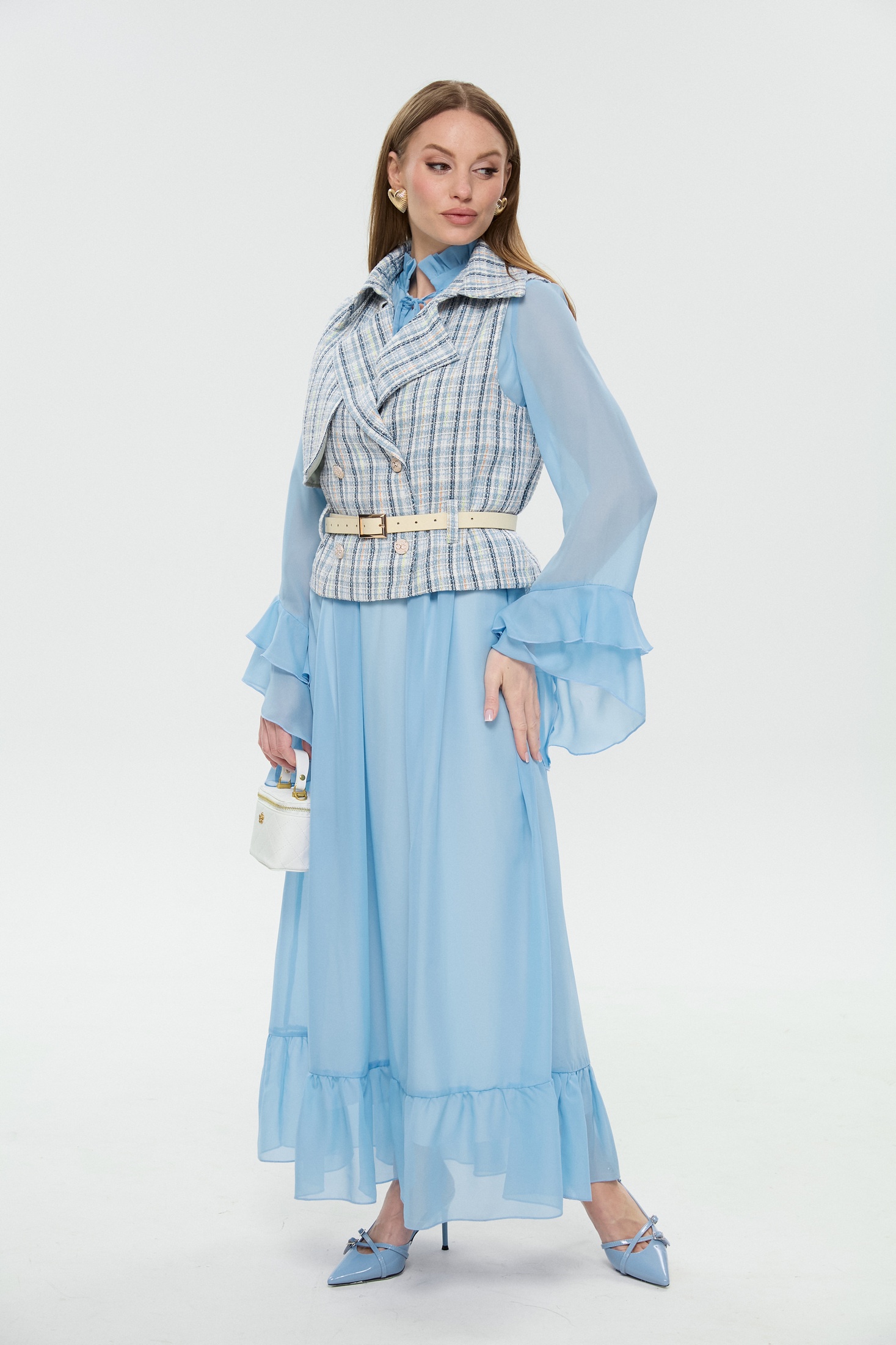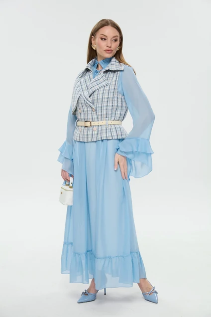 Костюм с платьем 1041-1 NikVa – это изысканный набор, который включает макси платье свободного кроя и двубортный жилет. Коллекция бренда NikVa предлагает высокое качество и стиль. Платье выполнено из шифона с завышенной линией талии и декорировано асимметричными воланами по низу юбки, создавая воздушный эффект. Оригинальный воротник-стойка с завязками и рюшей добавляет изящества. Жилет из хлопка с полиэстером и спандексом обеспечит комфорт и защиту. Детали включают отложной воротник на отрезной стойке и съемный ремень из экокожи. Костюм подходит для весенне-летнего сезона и идеально подходит для повседневного гардероба, предлагая легкость и комфорт благодаря своей светло-голубой палитре.