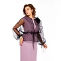 Шикарный наряд для вечерних выходов состоит из блузы и платья. Блуза выполнена из нежного темно-синего шифона, оснащена цельнокроеными рукавами с манжетами из основной ткани и застежкой на пуговицу на спине. Платье представляет собой модель полуприлегающего силуэта, сделано из блестящего темно-синего материала с добавлением стрейча для комфорта, без рукавов и на подкладке. Особое украшение наряда – съемный элемент в виде ручной работы цветка. Идеальный выбор для создания элегантного образа.